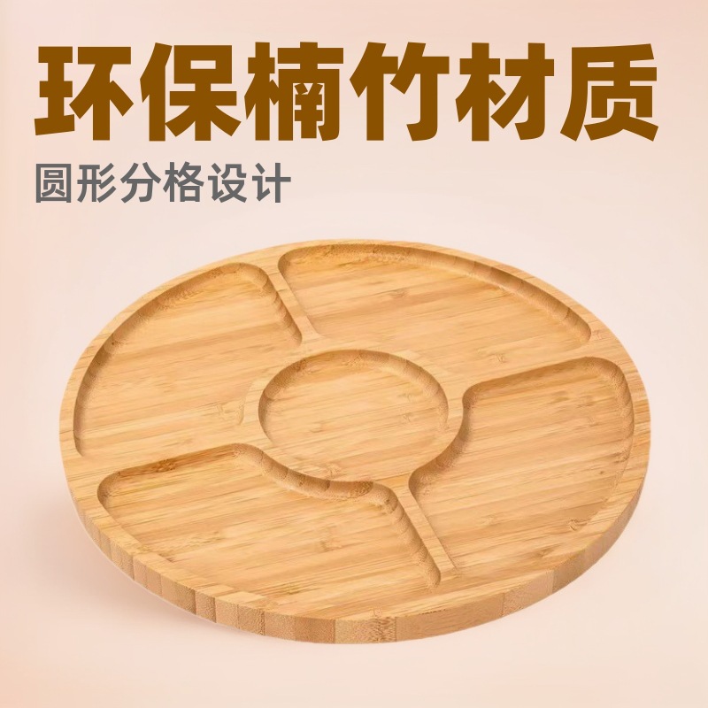 In-Stock Thickened Children's Safety Bamboo Round Compartment Tray Wooden Tableware Snack Tea Break Tray