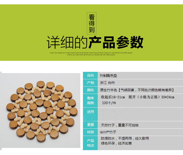 Estera de aislamiento térmico estera de mesa Estera de bambú hogar tazón estera a prueba de calor estera de placa vegetal estera de taza de té estera de la olla a prueba de calor
