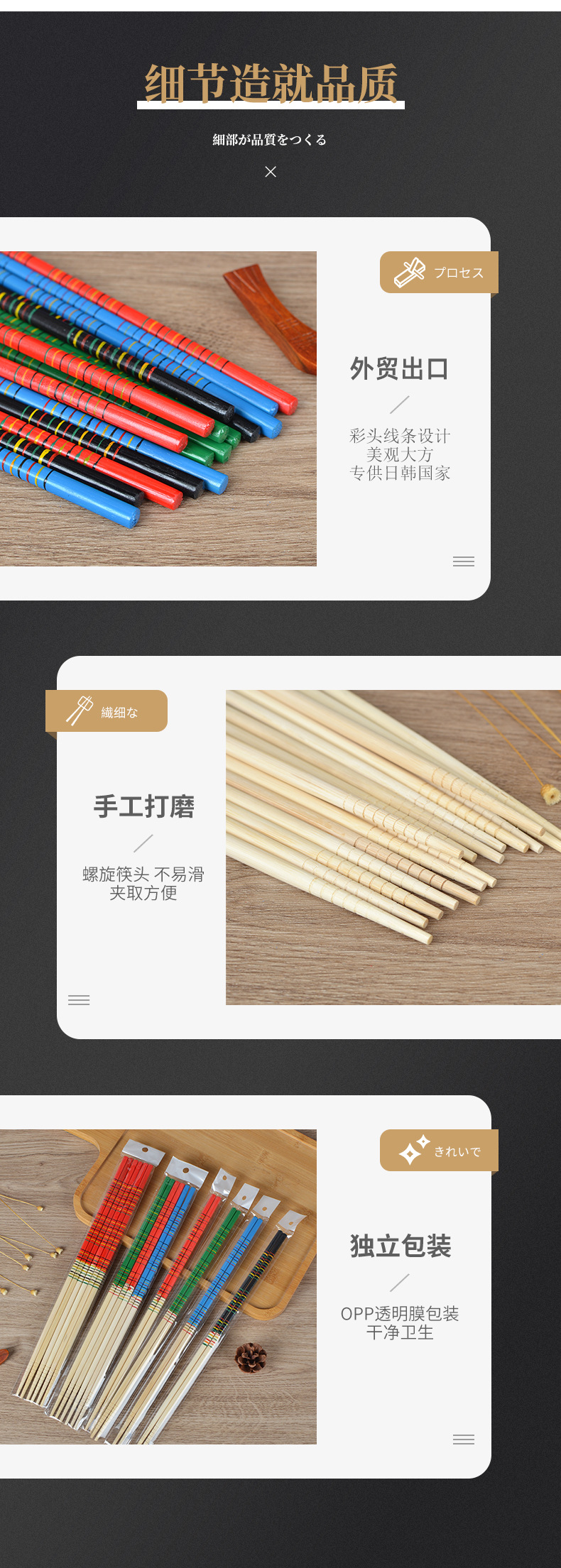 - Product categoryTableware chopsticksSpecificationsThree pairs of color matching (600 packs per box), Three pairs of the same color (600 packs per box), Two pairs of the same color (1000 packs per box), Single and double package, single color (2000 packs per box)