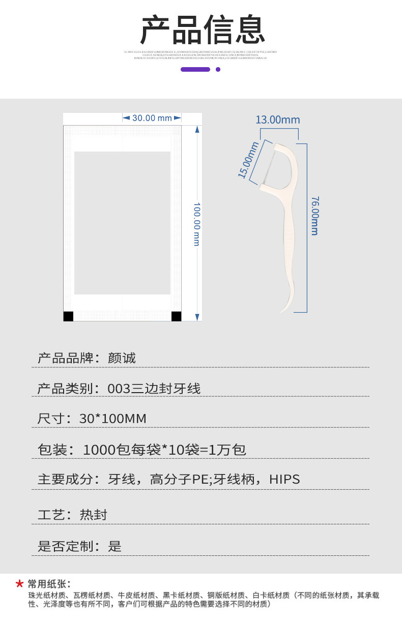 - Only count100-200 piecesSpecifications202 transparent film dental floss, 500/bag, 203 pure white dental floss 500/bag, 204 kraft paper dental floss, 500/bag, 201 white printed dental floss, 500/bag