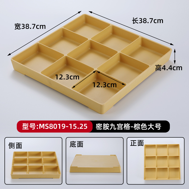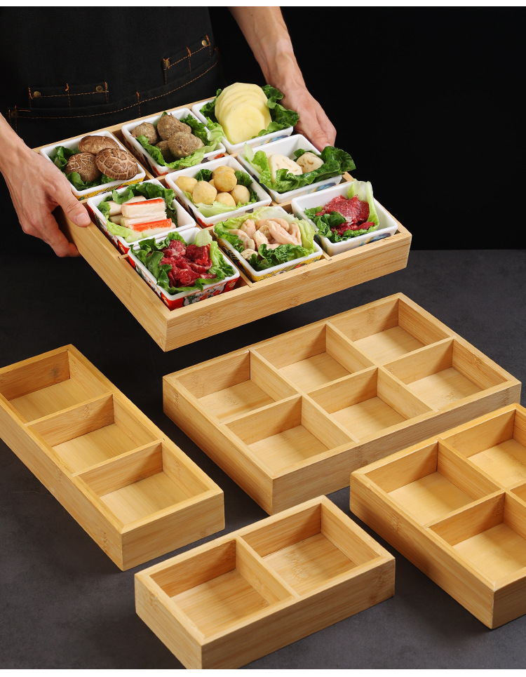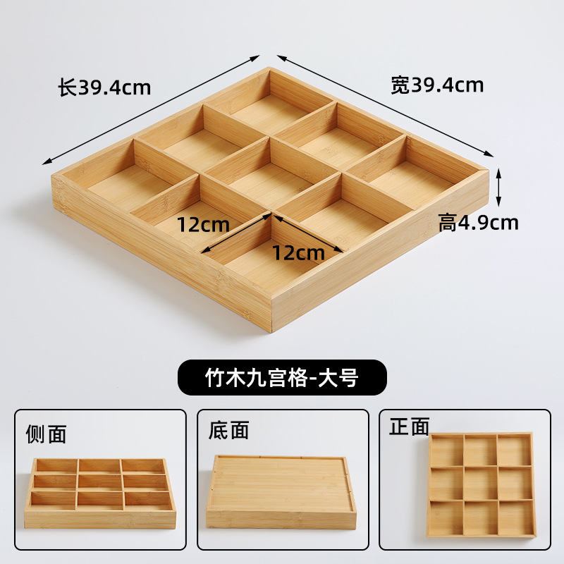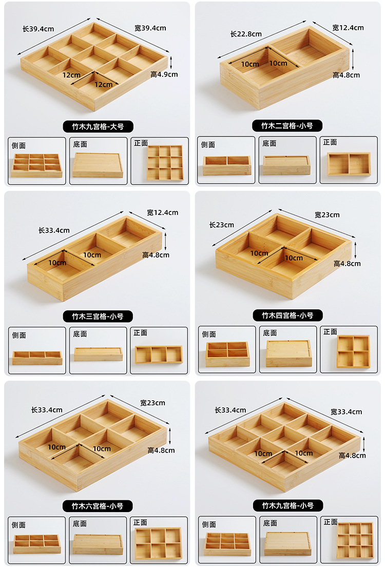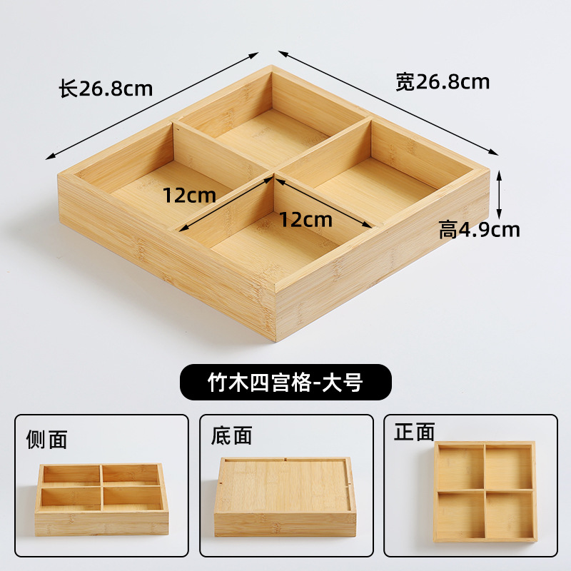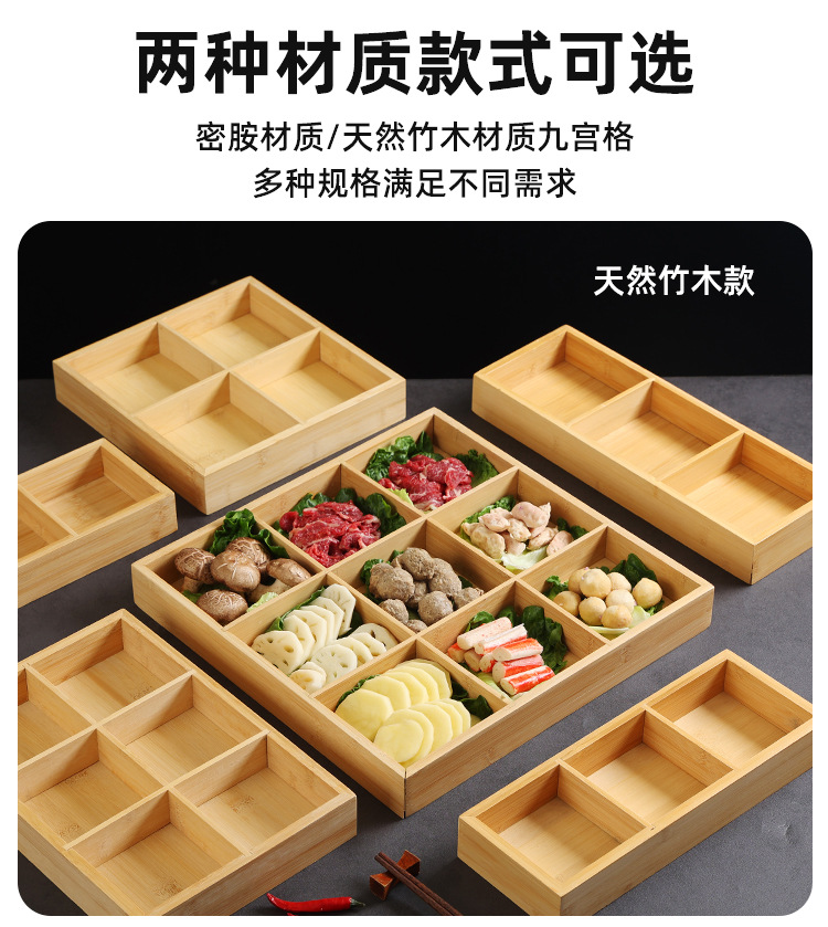 ColorBamboo and wood two-square grid-small size, Bamboo three-square grid-small size, Bamboo and wood four-square grid-small size, Bamboo six-square grid-small size, Bamboo nine-gong grid-small, Bamboo three-square grid-large size, Bamboo and wood four-square grid-large size, Bamboo six-square grid-large size, Bamboo nine-gong grid-large size, Melamine four-square grid-large size, Melamine six-square grid-large size, Melamine nine palace grid-large sizeDiameter10-10.9cm, 11-11.9cm, 12-12.9cm, 13–13.9 cm, 14–14.9 cm, 15-15.9cm, 16-16.9cm, 17–17.9 cm, 24-24.9cm