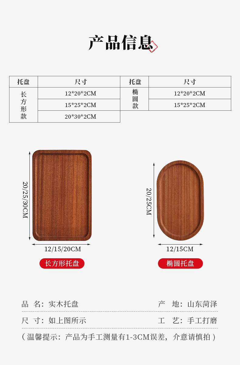 ColorBlack walnut oval 20*12*2cm, Black walnut oval 25*15*2cm, Black walnut rectangular plate 20*12*2cm, Black walnut rectangular plate 25*15*2cm, Black walnut rectangular plate 30*20*2cm, Beech oval 20*12*1.5cm, Beech oval 25*15*1.5cm, Beech rectangular plate 20*12*2cm, Beech rectangular plate 25*15*2cm, Beech rectangular plate 30*20*2cm, Splicing acacia wood oval 20*12*1.5cm, Splicing acacia wood oval 25*15*1.5cm, Spliced acacia wood rectangular plate 20*12*1.5cm, Spliced acacia wood rectangular plate 25*15*1.5cm, Spliced acacia wood rectangular plate 30*20*1.5cmDiameter18-18.9cm