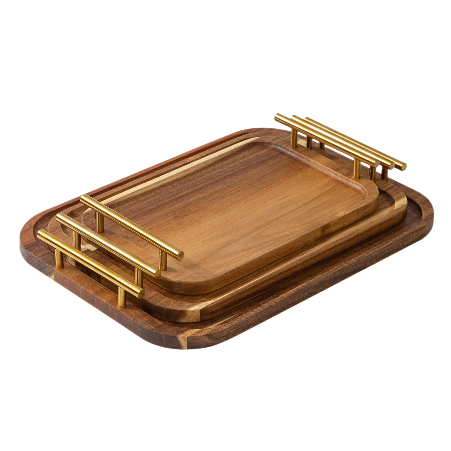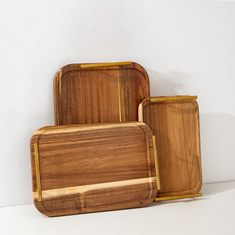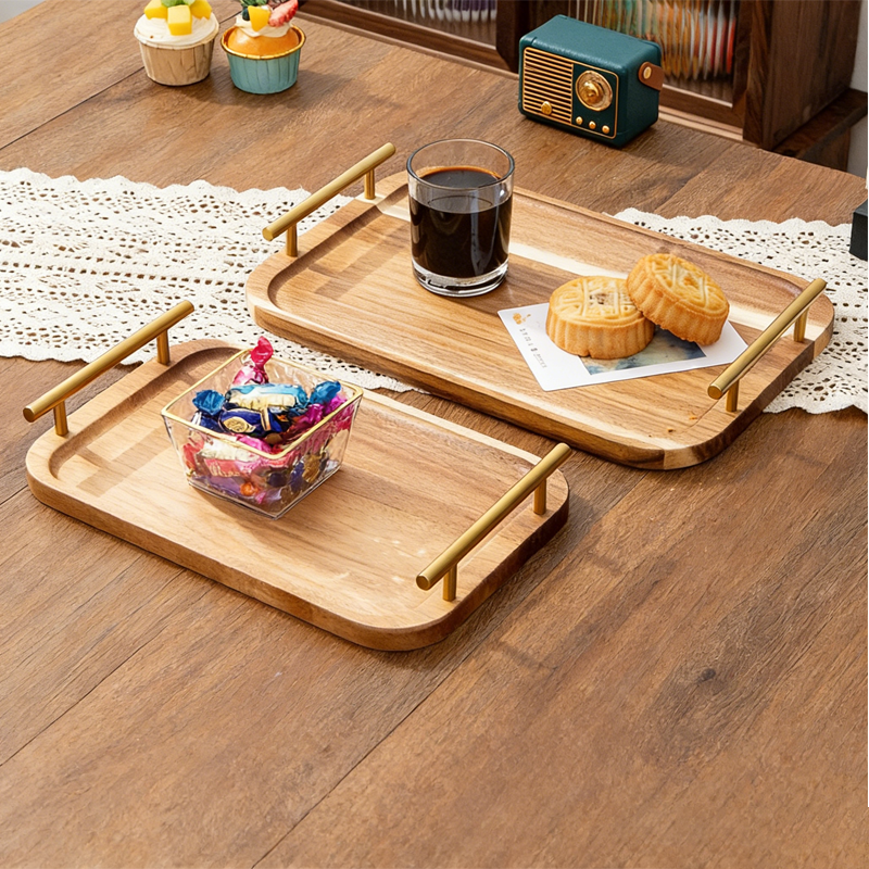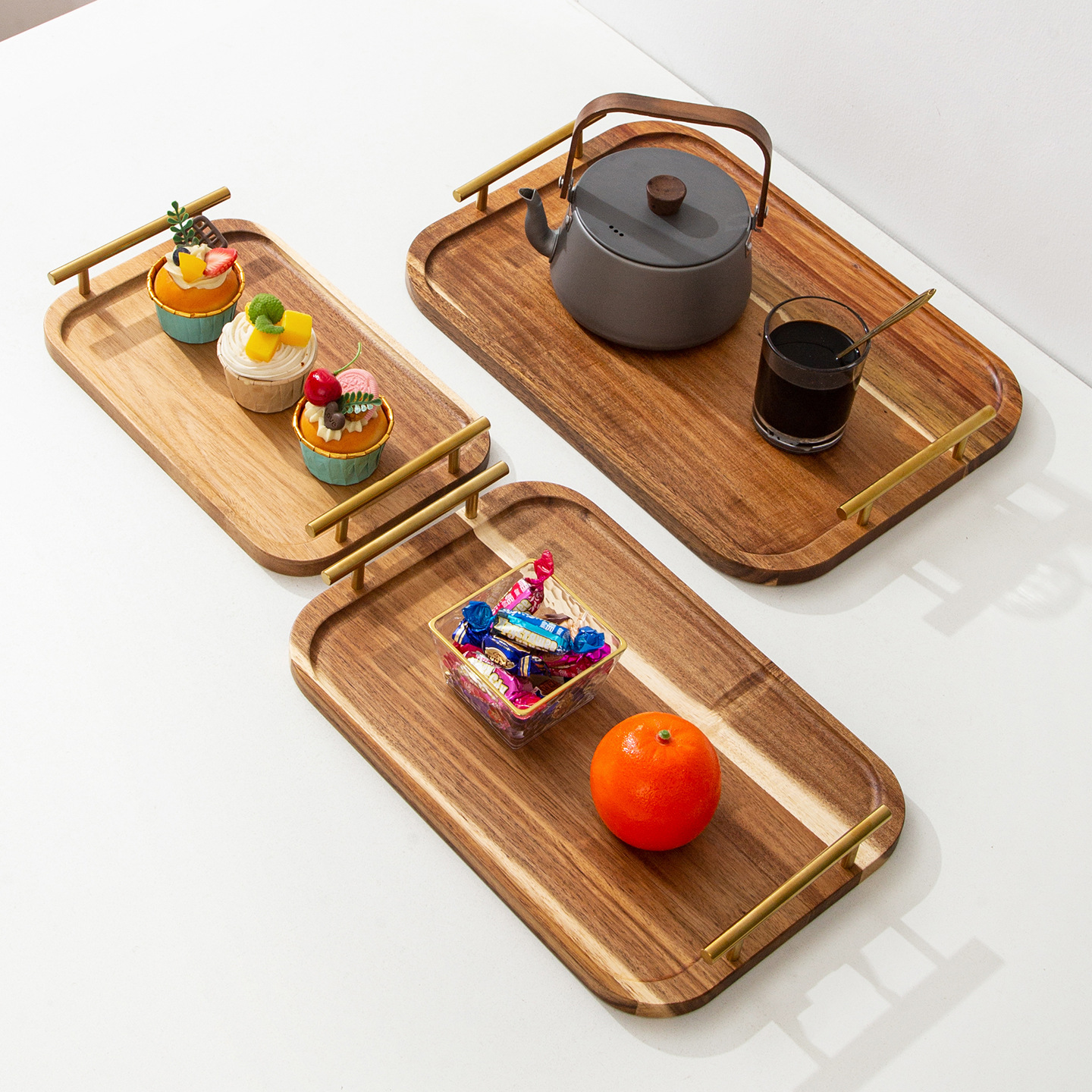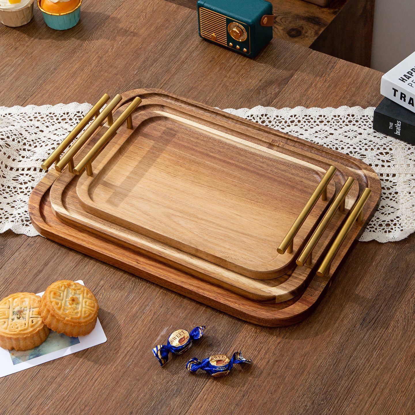 Деревянный поднос для десерта в японском стиле Чайный поднос для дома в гостиной, легкий роскошный прямоугольный поднос с золотой ручкой Чайный поднос